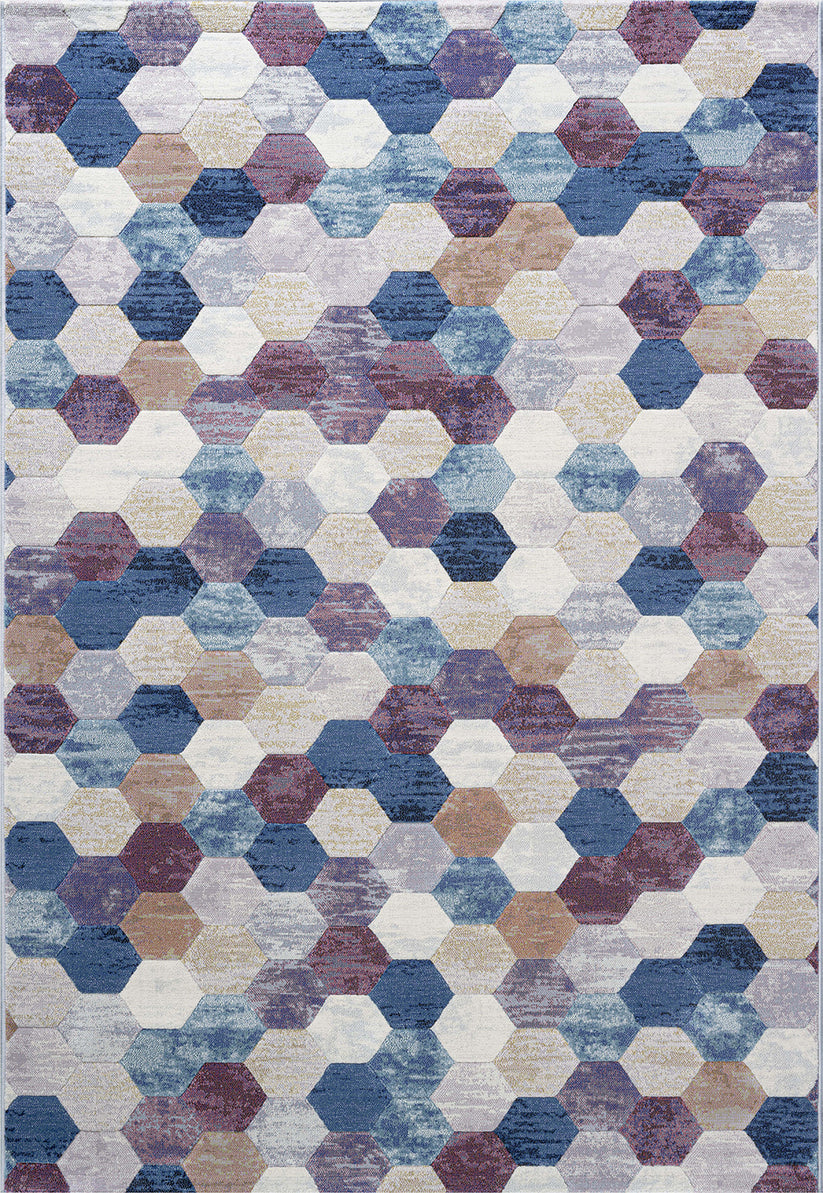 Alfombra Hex Blue en color azul, beige, gris y morado, disponible en diferentes tamaños.