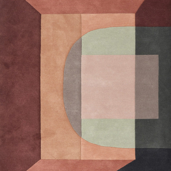 Alfombra Window con un diseño de formas geométricas muy original, para los amantes del Art déco. Fabricada de lana 100% en tonalidades de colores terrosos, como el burdeos, verde, naranja, marrón, verde y gris.
