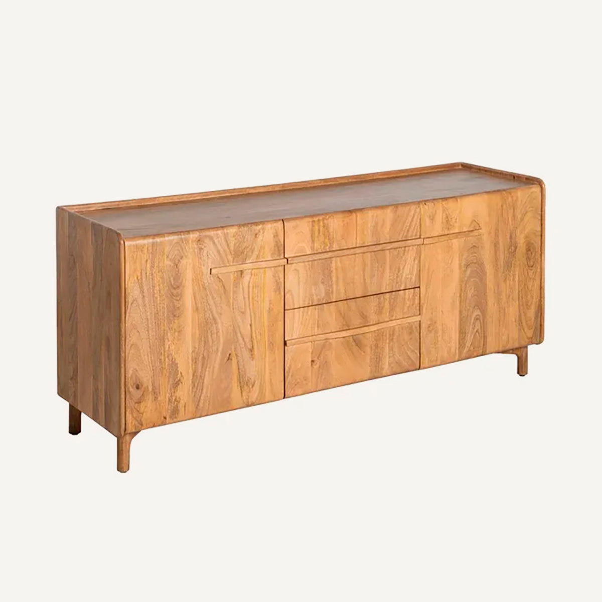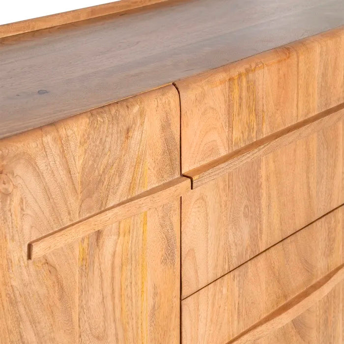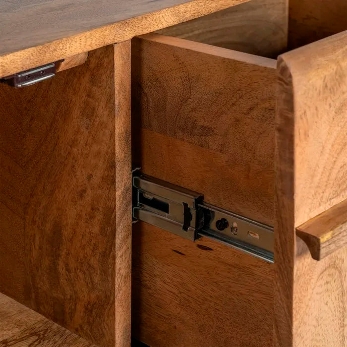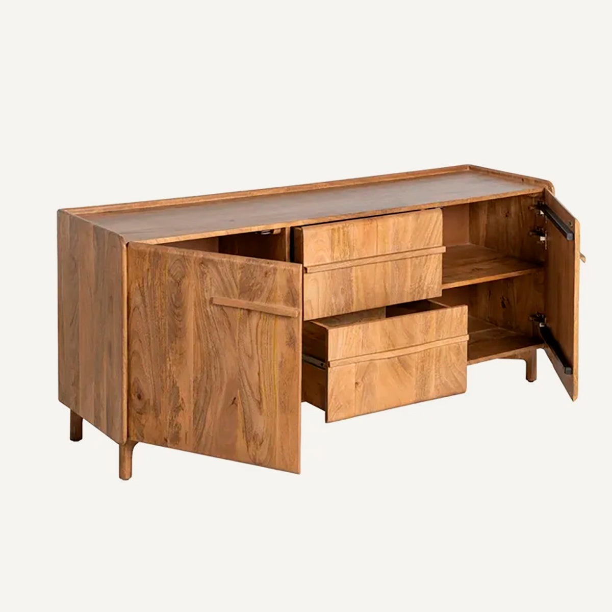Aparador Arohi fabricado en madera de mango, color marrón. Su acabado natural con betas y tiradores originales, realza el diseño de su forma envolvente y acabado redondeado. Cuenta con dos puertas, dos cajones y unos huecos en el interior para un mayor almacenamiento.