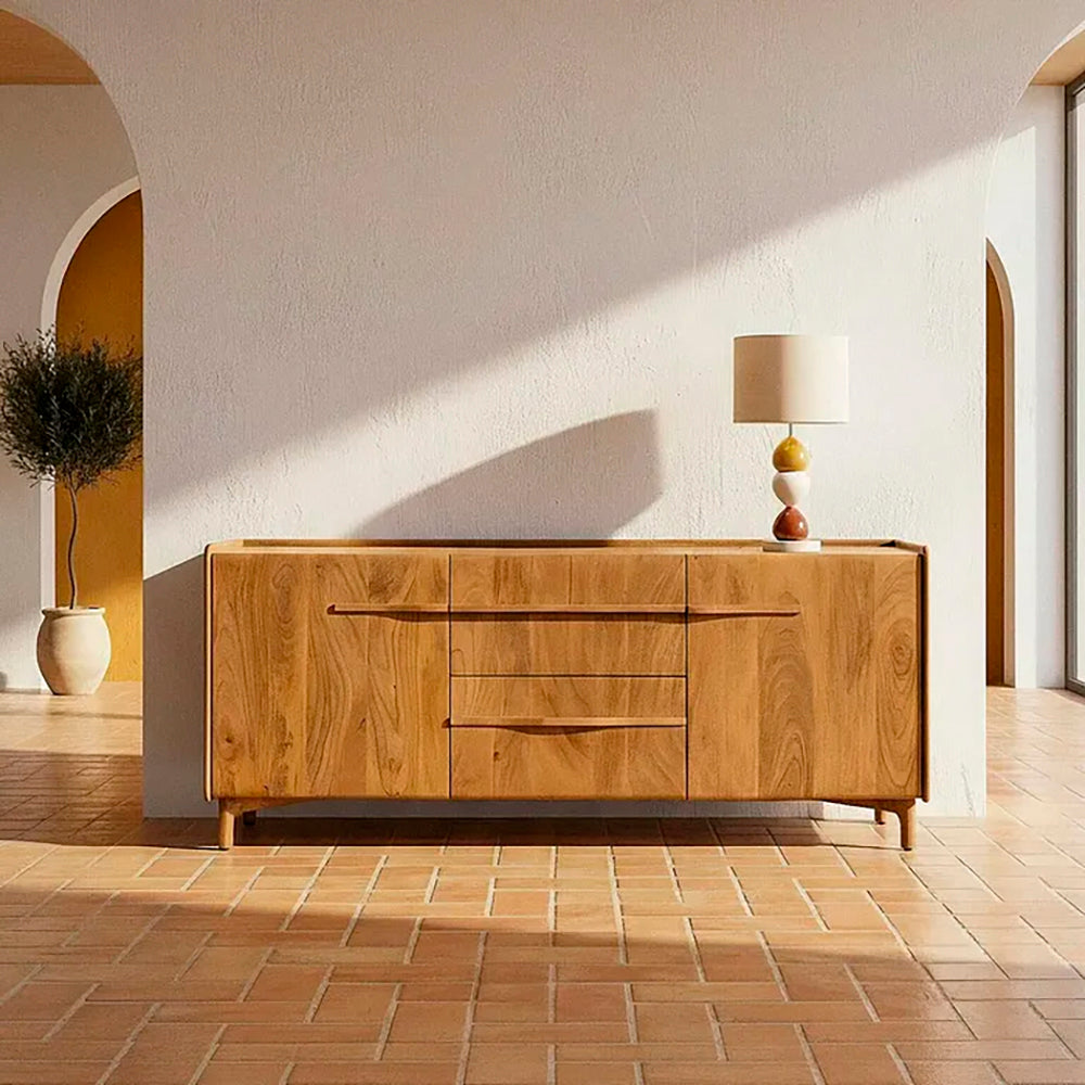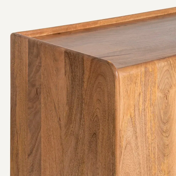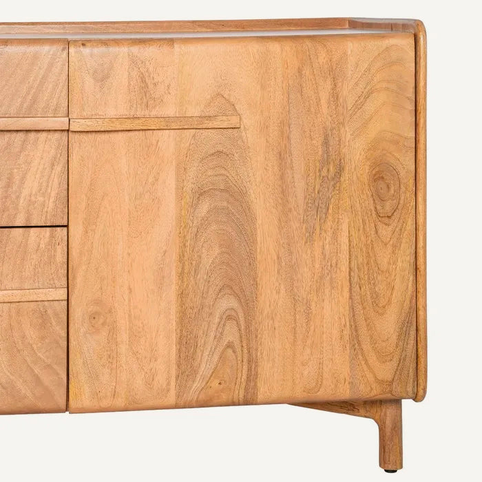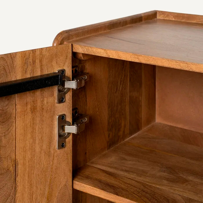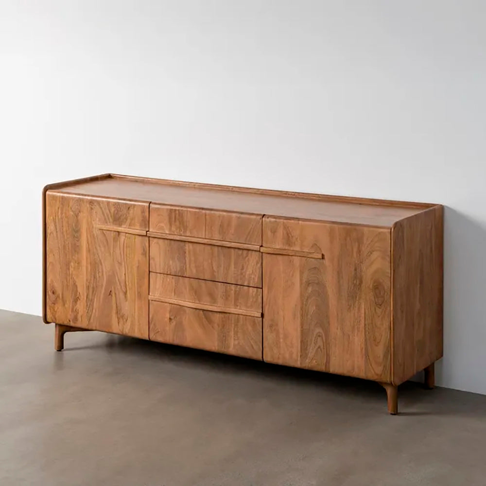 Aparador Arohi fabricado en madera de mango, color marrón. Su acabado natural con betas y tiradores originales, realza el diseño de su forma envolvente y acabado redondeado. Cuenta con dos puertas, dos cajones y unos huecos en el interior para un mayor almacenamiento.