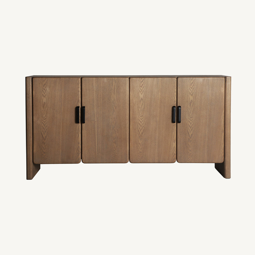 Aparador Busk fabricado en madera de fresno combinado con madera DM y tiradores de hierro. Sus puertas con bordes redondeados y tiradores en negro le dan un estilo contemporáneo y sofisticado.