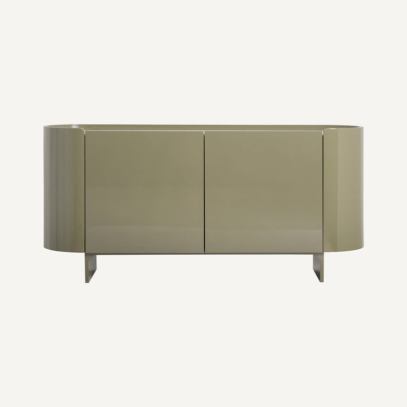 Aparador Stage en color verde oliva con detalles cerámicos en blanco. Fabricado en madera DM combinado con base de cerámica.