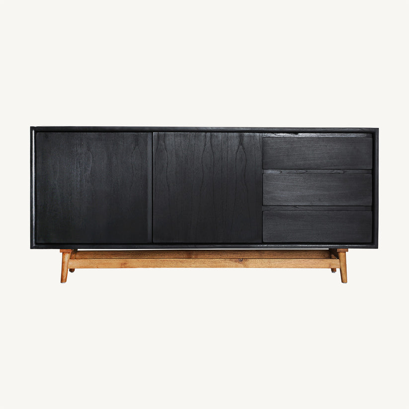 Aparador Thiers en color negro y marrón, de estilo nórdico. Fabricado en madera mindi, combinado con madera contrachapada. Producto desmontable.