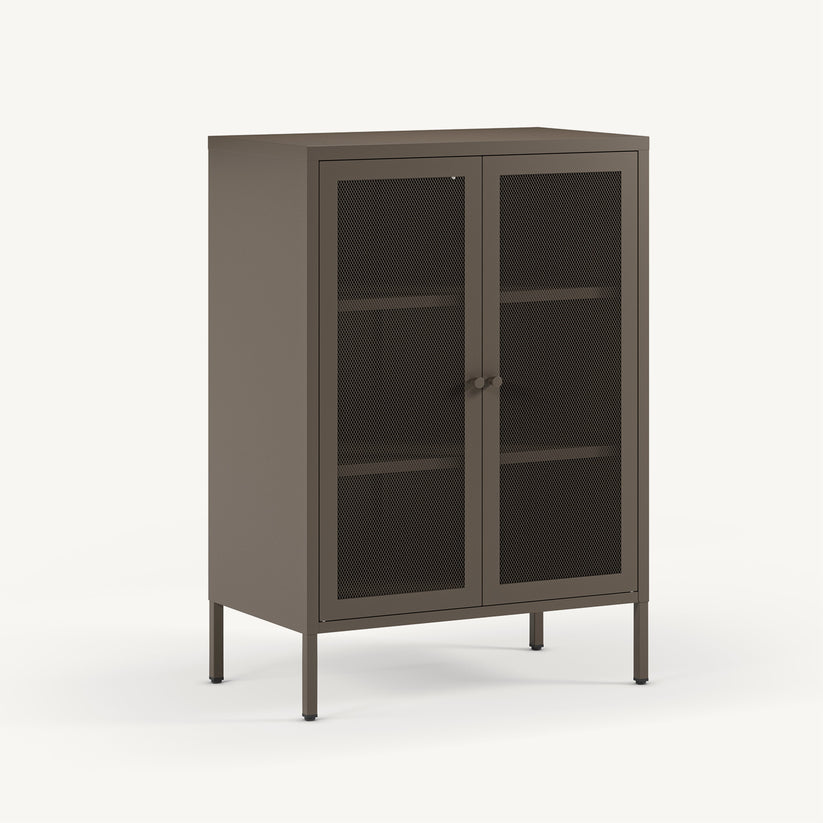 Armario bajo Fayna en color marrón moca o burdeos, fabricado en metal con una estructura de líneas limpias. Cuenta con dos puertas de rejilla y tres baldas en su interior para un almacenamiento de objetos decorativos, vajillas o libros.
