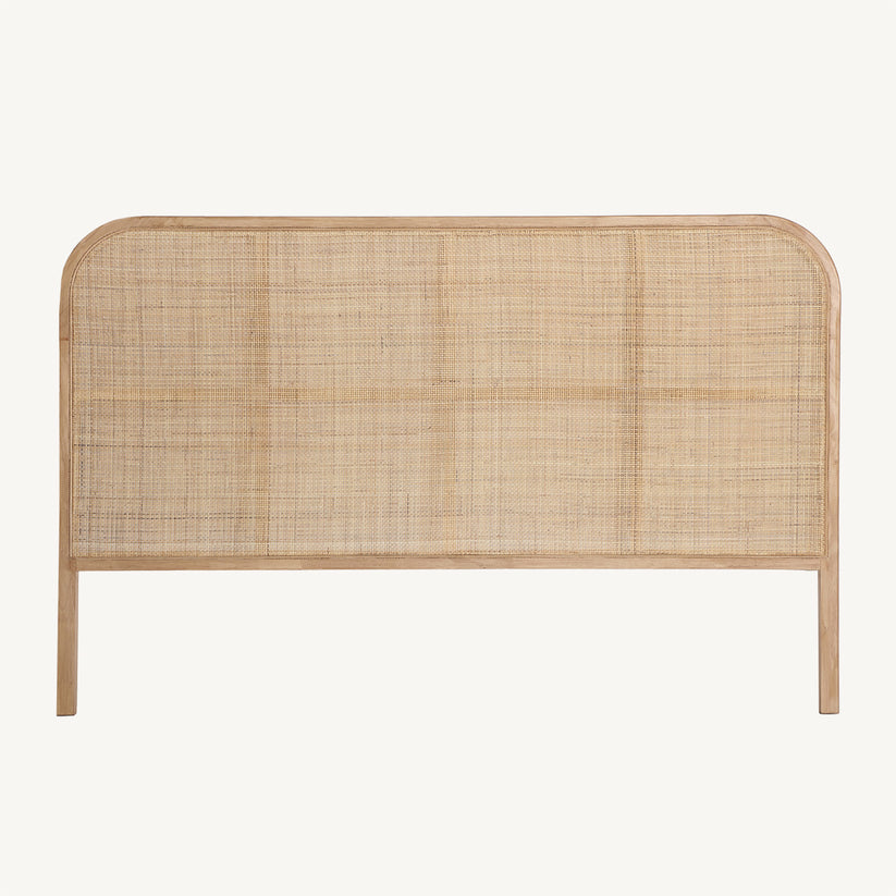 Cabecero Ikla en color marrón claro, de estilo nórdico. Fabricado en madera de fresno combinado con ratán, esta pieza combina la elegancia y funcionalidad en mobiliario. Es ideal para camas grandes, aportando estilo y sofisticación al dormitorio.