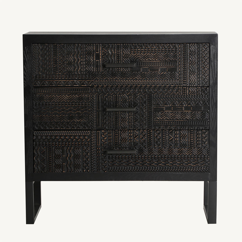 Cómoda cuadrada Antrim en color negro envejecido, de estilo contemporáneo. Fabricada en madera de fresno, combinado con hierro y madera dm. Producto desmontable.