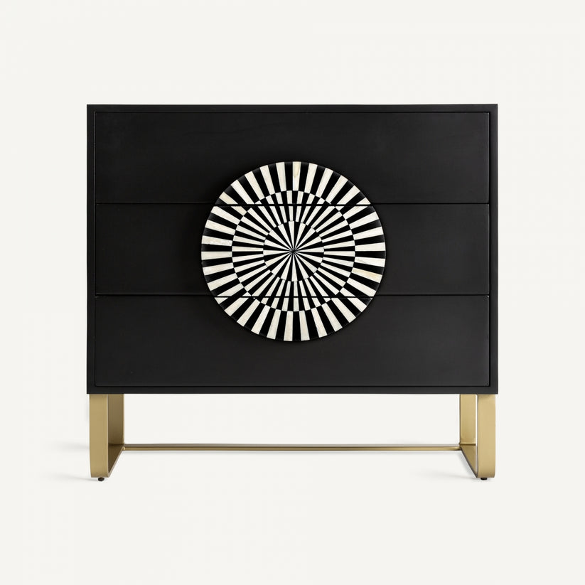 Cómoda Gatsby, inspirada en la era dorada. Fabricada en hierro con detalles en hueso, este diseño bicolor negro y blanco captura la esencia del estilo Art déco.