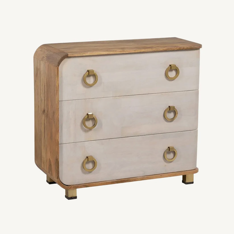 Cómoda Rahui fabricada en madera de mango color natural y blanco, combinado con hierro dorado en las patas y sus sofisticados tiradores. Cuenta con tres amplios cajones y una estructura robusta que garantiza almacenamiento, resistencia y durabilidad.