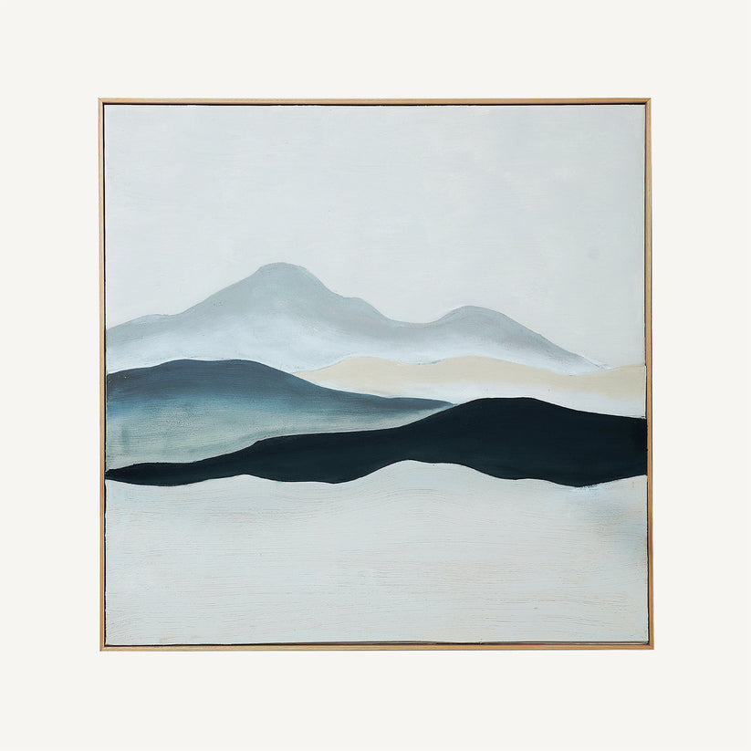 El cuadro artesanal Erkan en tonos azules, combina el arte contemporáneo con la calidez de lo artesanal. Pintado a mano sobre lienzo de alta calidad, presenta un acabado texturizado con suaves degradados de azul y formas inspiradas en paisajes abstractos, transmitiendo sensación de calma y serenidad.