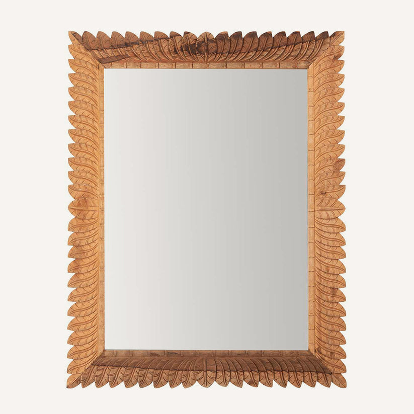 Espejo Abubilla en color marrón natural, fabricado en madera de teca y cristal.