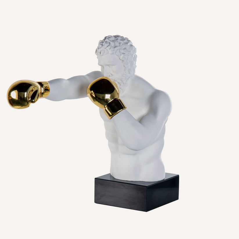 Figura de boxeador, Manny, en color blanco y dorado, fabricada en metal combinado con mármol. Esta espectacular figura de estilo glam, es una pieza única perfecta para destacar cualquier espacio. Inversión segura para los amantes del arte.