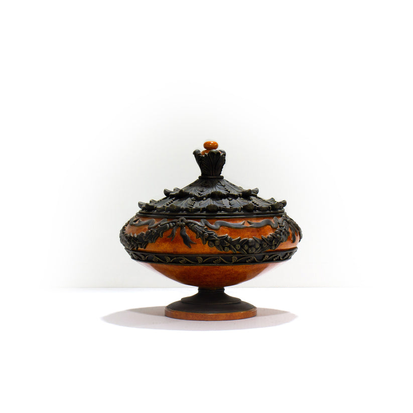 Jarrón Hopo, en color ámbar y negro, de estilo romántico. Fabricado de cerámica con detalles naturales y formas decorativas.