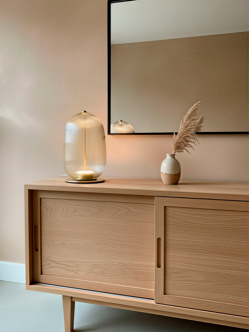 Añade carácter y calidez a cualquier espacio con esta lámpara de mesa en acabado oro, pensada para atraer todas las miradas. Su portalámparas de cristal estriado crea una luz suave y envolvente, perfecta para el salón o el dormitorio.