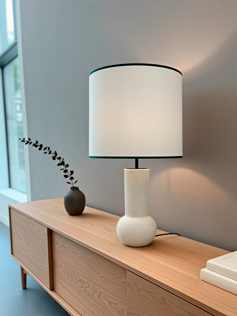 Lámpara de mesa en color blanco y negro, con un portalámparas. Fabricada de acero y tejido en pantalla. Su diseño se inspira en la decoración natural y añade un toque único a la estancia donde sea colocada.