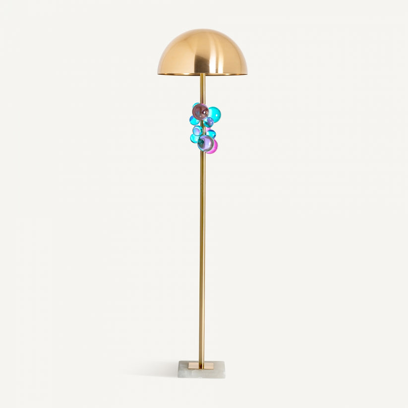 Lámpara de pie Inch de estilo Art déco, multicolor, combina el vidrio con el hierro. Fabricada de hierro, mármol y cristal, esta lámpara guarda la esencia de lo clásico junto a la infraestructura circular que hace un guiño a la sofisticación.