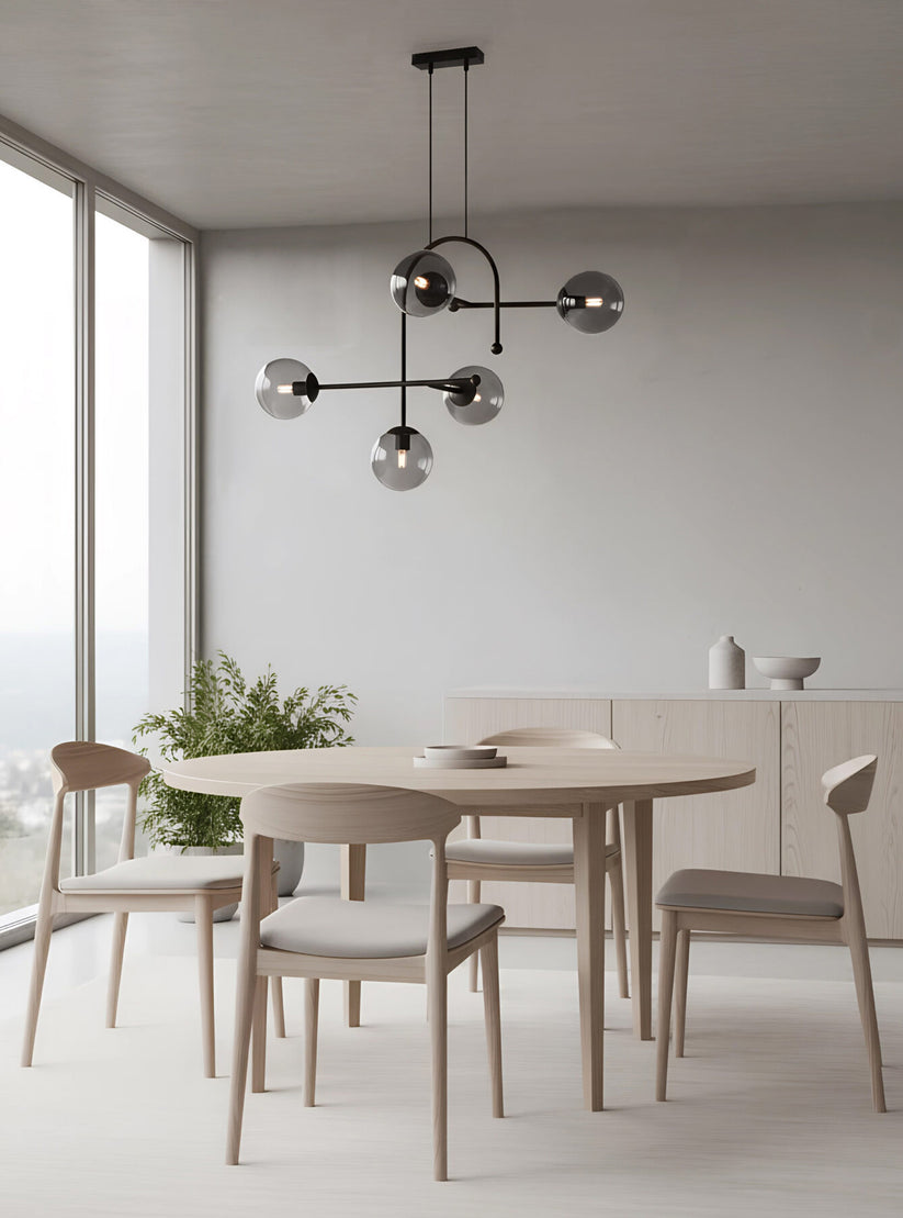 Lámpara de techo en color negro con 5 esferas de vidrio ahumado negro. Fabricada de acero, además de iluminar se convierte en una pieza central de la decoración. Esta lámpara es perfecta para salones y comedores.