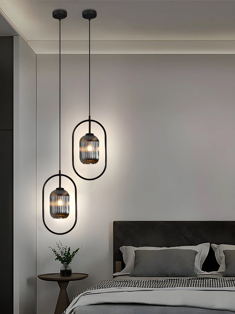 Lámpara colgante de techo, tipo luminaria, fabricada de acero en color negro con un portalámparas de cristal. Perfecta para decorar el dormitorio y complementar tu mesita de noche.