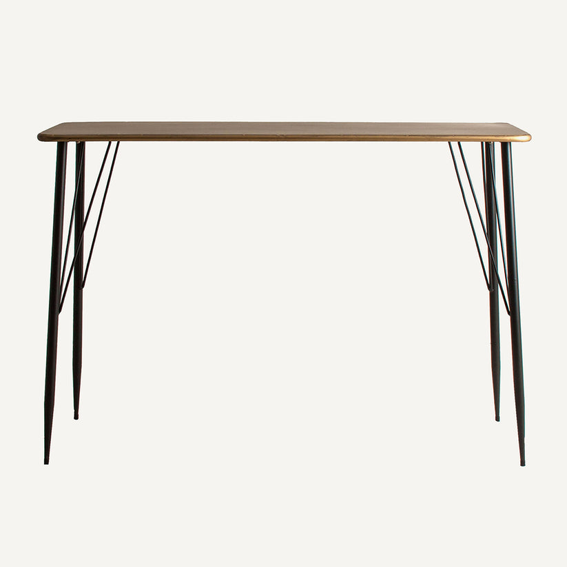 Mesa de escritorio Reken, fabricado en metal dorado con patas de hierro color negro. Resistente y fácil de limpiar.