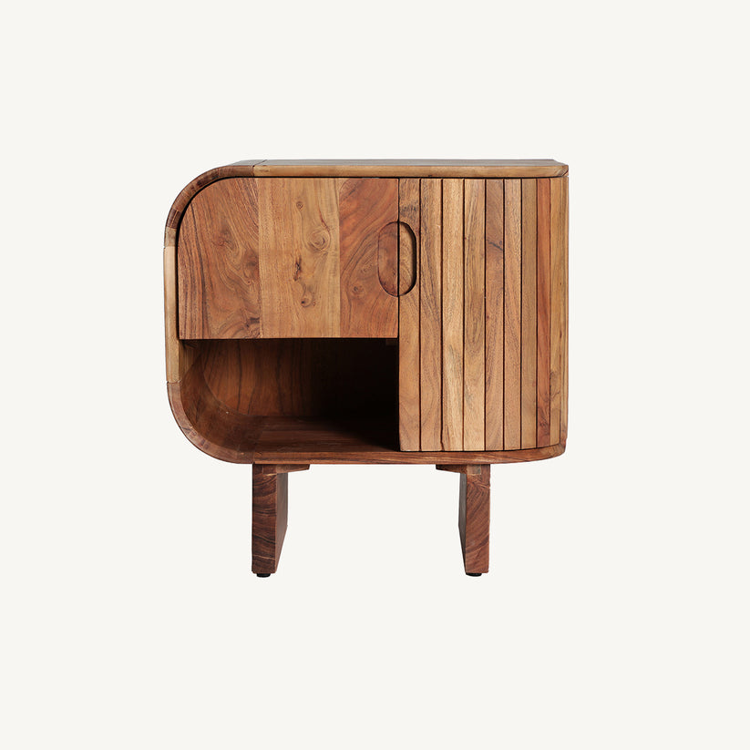 Mesita de noche Blesle en color marrón, de estilo contemporáneo escandinavo, dispone de varias baldas y compartimentos con doble puerta. Fabricada con líneas curvas en madera de acacia combinada con madera dm. Producto desmontable.