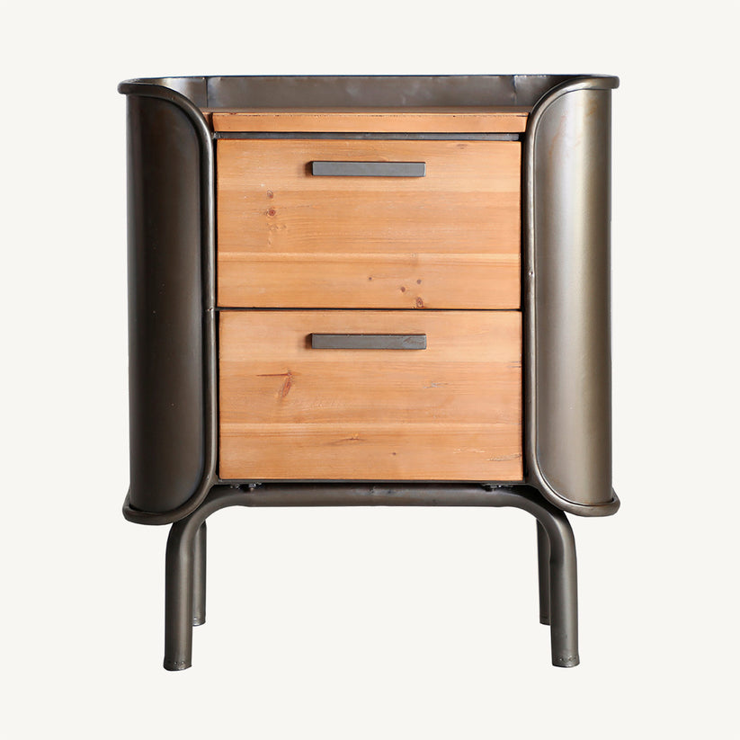 Mesita de noche Briec en color marrón y gris. Fabricada con una estructura metálica de hierro en color gris oscuro, cajones de madera de abeto natural combinado con madera dm, es perfecta para guardar las piezas de ropa más pequeñas. Gracias a su diseño industrial y versátil, es una pieza fácil de combinar con otros muebles de varios estilos en cualquier dormitorio.