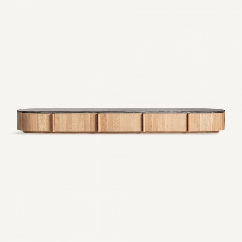 Mueble TV Nara en color negro/marrón, de estilo contemporáneo. Fabricado en madera de roble, combinado con mármol. Producto desmontable.