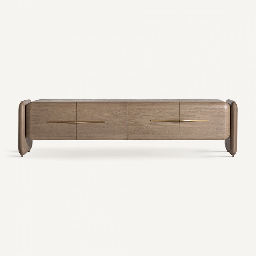 Mueble TV Ussel en color marrón/oro, de estilo Art déco. Fabricado en madera de roble, combinado con latón.