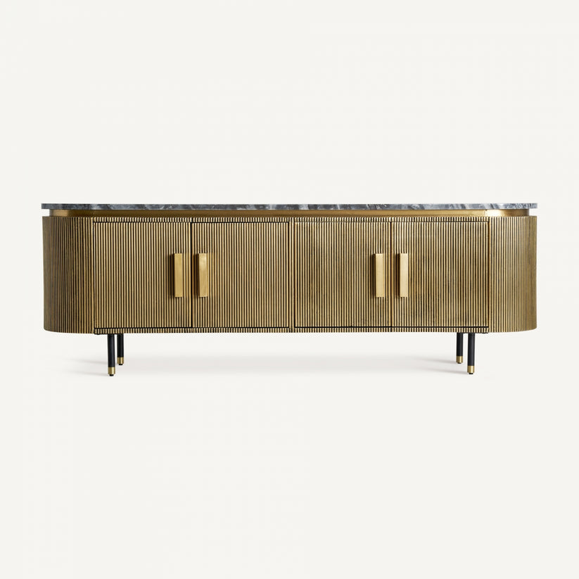 Este mueble TV Valbruna está diseñado para los que buscan un aire sofisticado en el salón. Su estructura de hierro en color oro envejecido combina a la perfección con el mármol en negros y blancos. Una pieza única que fusiona la estética de los veinte con un toque elegante más moderno.