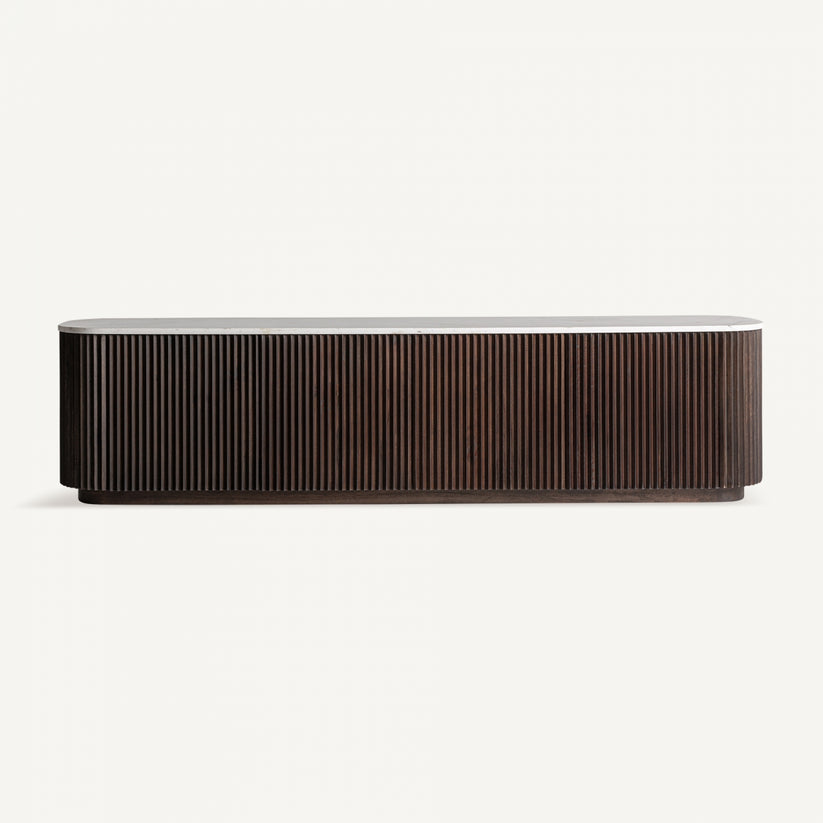 Mueble TV Cenves, en color marrón. Una pieza única que combina la calidez de la madera de mango con la elegancia del mármol blanco, inspirado en el estilo Art déco.