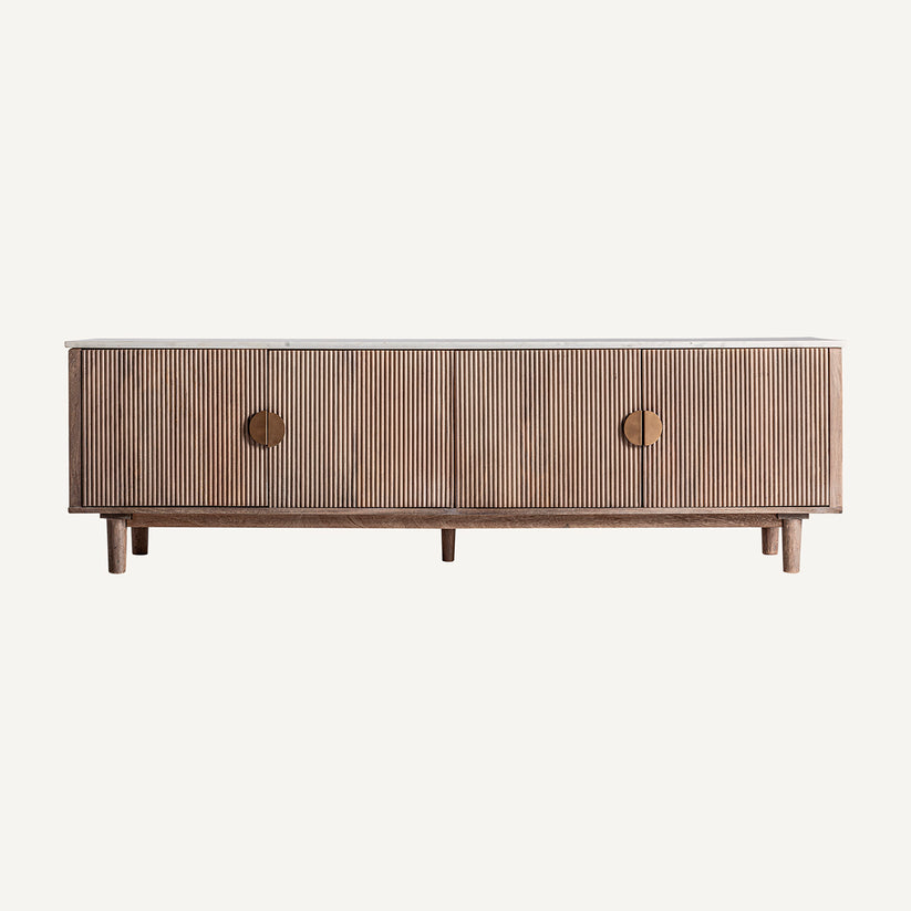 Mueble TV Zerf fabricado en madera de mango, mármol color blanco y madera DM en color marrón. Cuenta con cuatro puertas y dos estantes en el interior con grandes huecos, para un mayor almacenamiento.