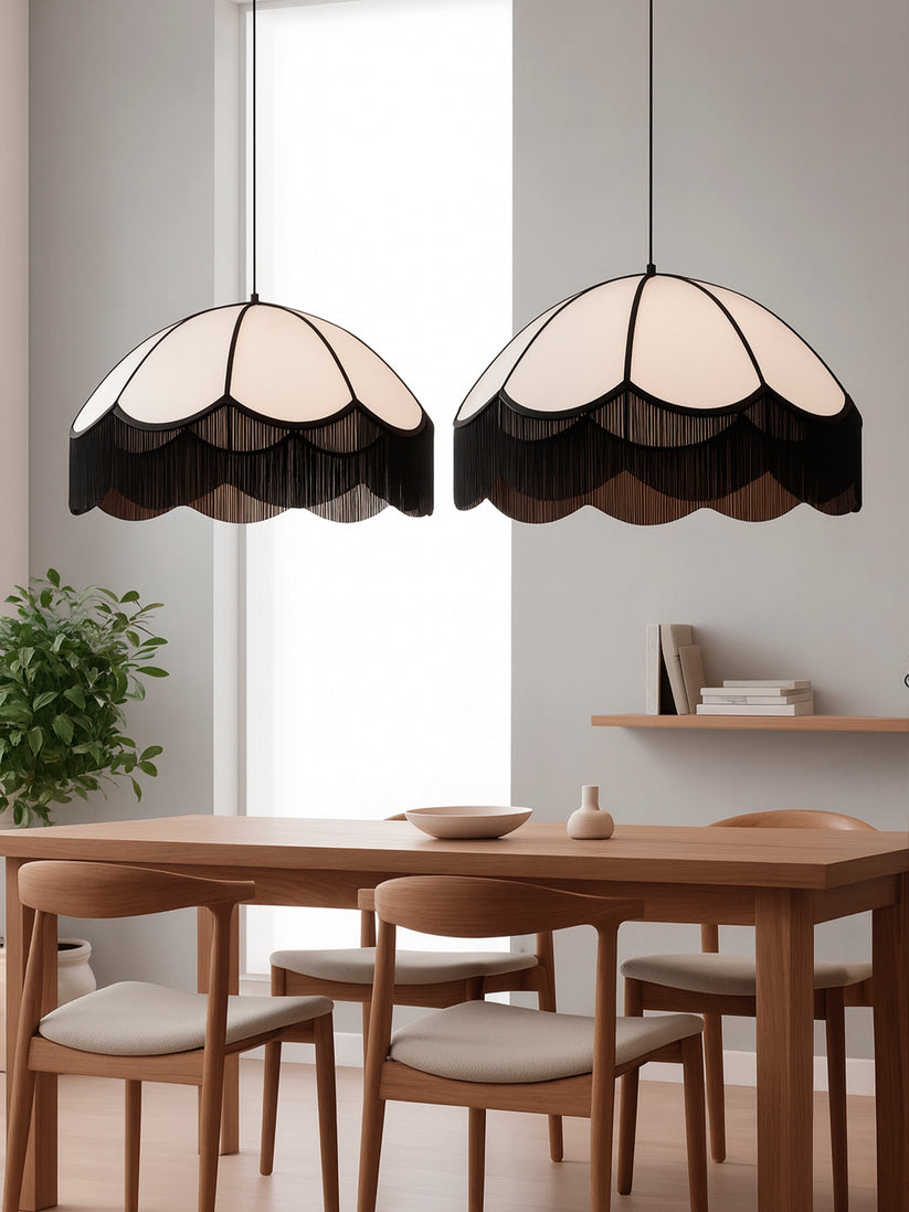 Lámpara de techo con pantalla premium en color blanco y flecos en negro. Fabricada de manera artesanal con acero y tejido tipo terciopelo negro.