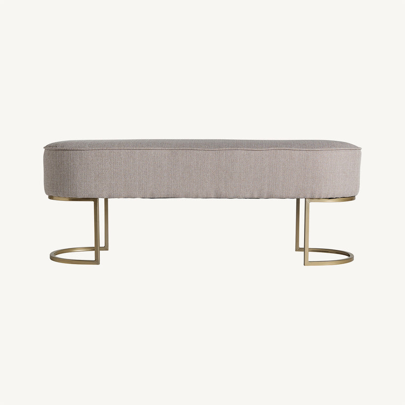 Pie de cama Sousel en color marrón claro y detalles dorado, de estilo contemporáneo. Fabricado en madera de pino, hierro y algodón bouclé, combina la suavidad de la tela con la solidez del metal, creando una pieza versátil y moderna para cualquier espacio. Su diseño minimalista y elegante lo hace ideal tanto para salones como para dormitorios, ofreciendo un toque de sofisticación sin perder funcionalidad.