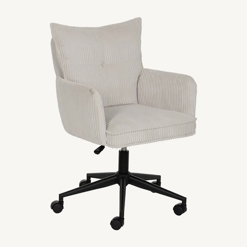 Silla de escritorio Pae, con ruedas, reposabrazos y posibilidad de diferentes alturas del asiento. Fabricada de metal color negro en las patas y tejido de pana poliéster 100% en color crema.