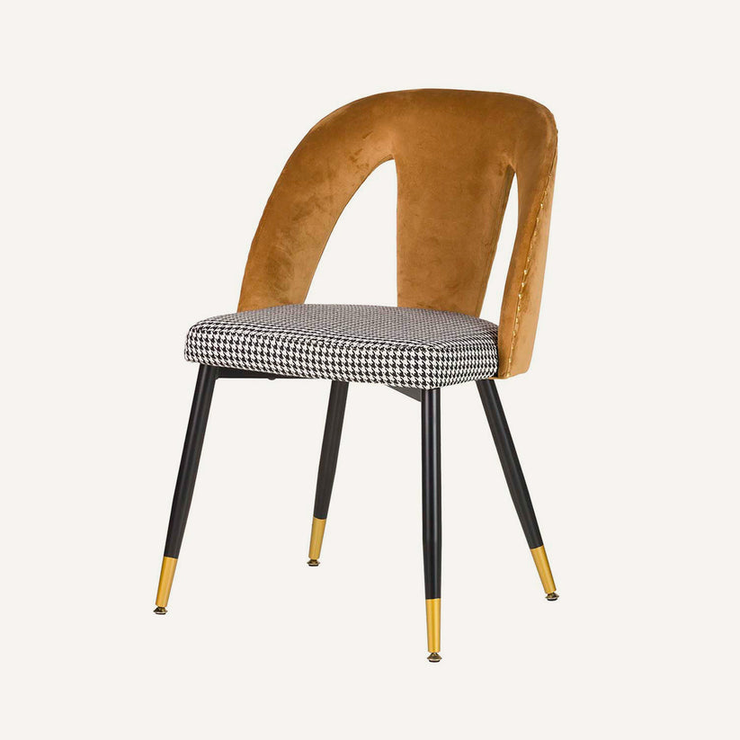 Silla Petra fabricada con metal y madera MDF, en color amarillo de tejido terciopelo velvet con asiento en tela vichy negro. Envuelta de tachuelas doradas y patas en negro con puntas doradas, esta silla combina el estilo y el confort.