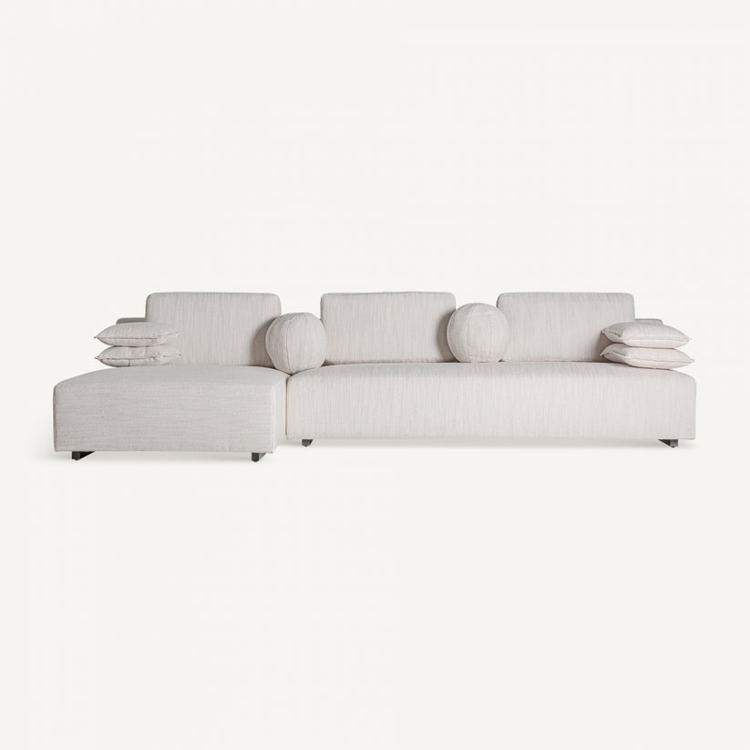 El sofá Traun es un tapizado en color blanco roto de grandes proporciones, sus más de 3 metros ofrecen tres plazas amplias con chaise longue.