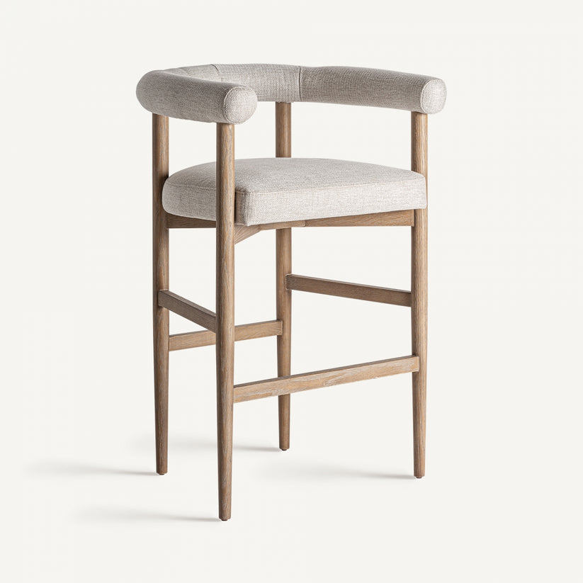 Taburete Lazins en color blanco roto, de estilo contemporáneo. Fabricado en madera de fresno, combinado con poliéster y espuma.