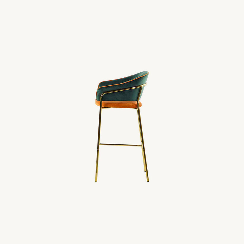 Taburete Virola en color verde y naranja con estructura en dorado. Fabricado en metal, mdf y tejido velvet.